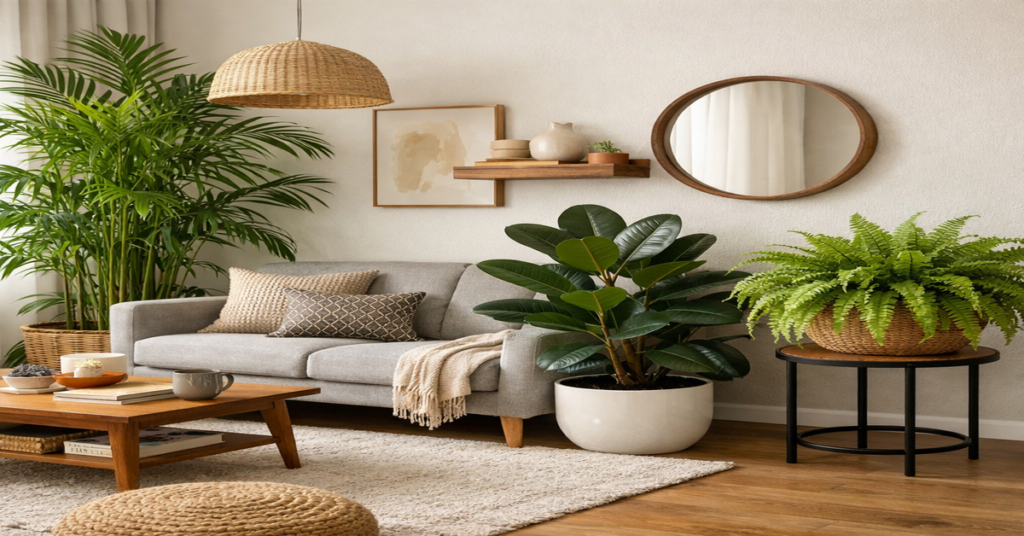 - Living Areas: Rubber plants, bamboo palms, Boston ferns