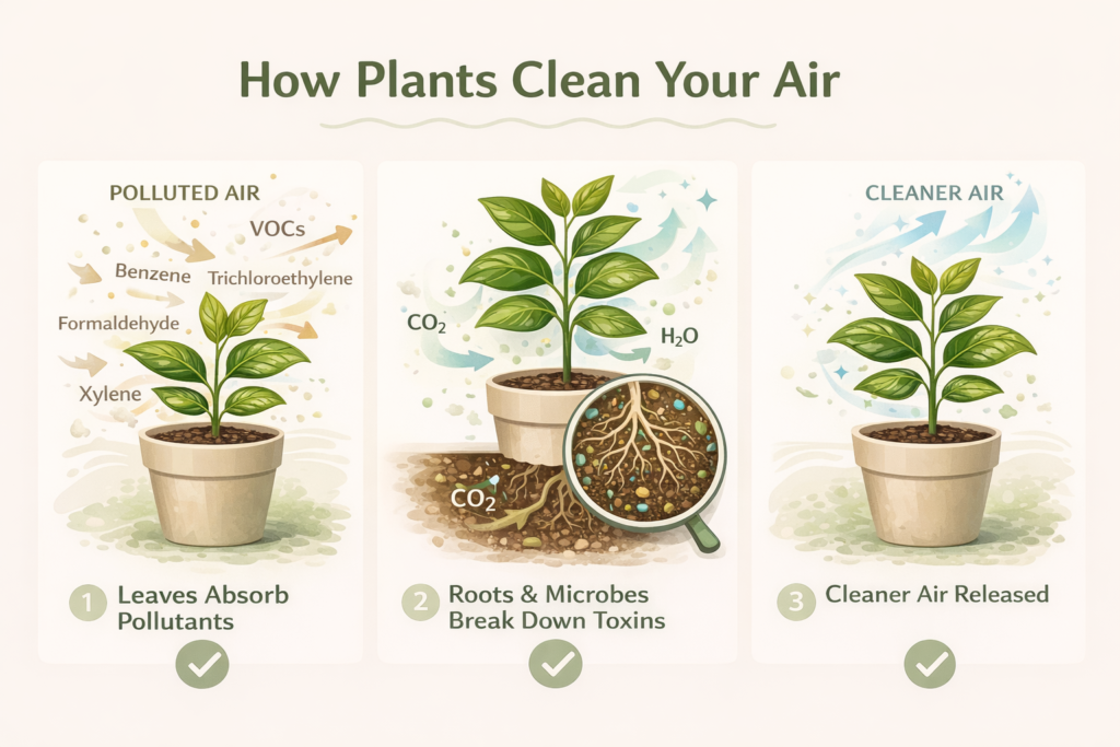 While NASA’s study was conducted in sealed chambers, subsequent research has confirmed that plants do improve indoor air quality through: