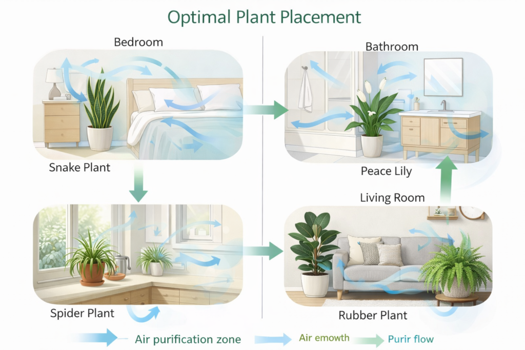 - Bedrooms: Snake plants (night oxygen), Chinese evergreens